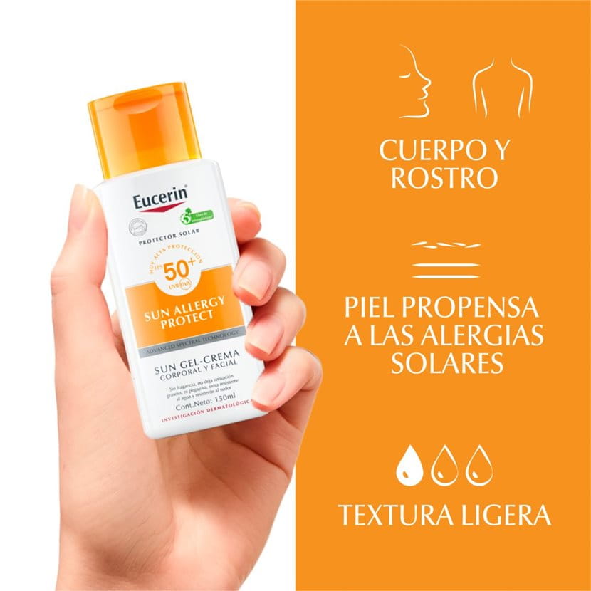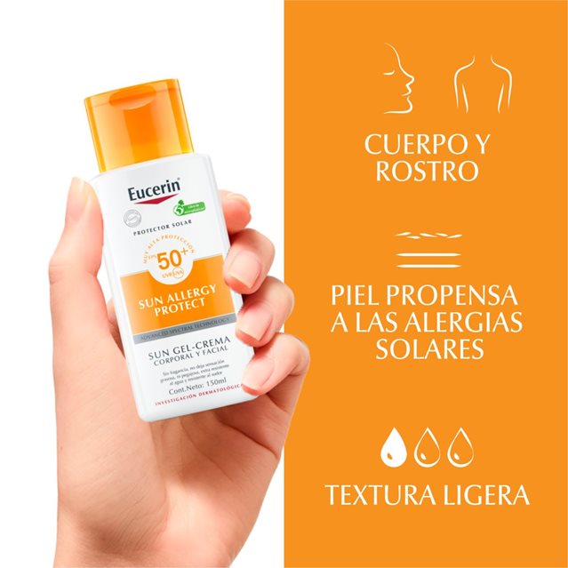 Eucerin Sun Creme-Gel Allergy Protect FPS 50 es un protector solar para el cuerpo y el rostro, formulado especialmente para la piel propensa a las alergias inducidas por el sol como la erupción solar polimorfa (ESP). La Advanced Spectral Technology combina filtros UVA/UVB fotoestables de banda ancha (1) para brindar protección alta contra la radiación UV con la Licochalcona A para neutralizar los radicales libres inducidos por los rayos UV y la luz HEVIS. También contiene Alfa-Glucosilrrutina, que ayuda a prevenir las alergias inducidas por el solo, como la ESP.